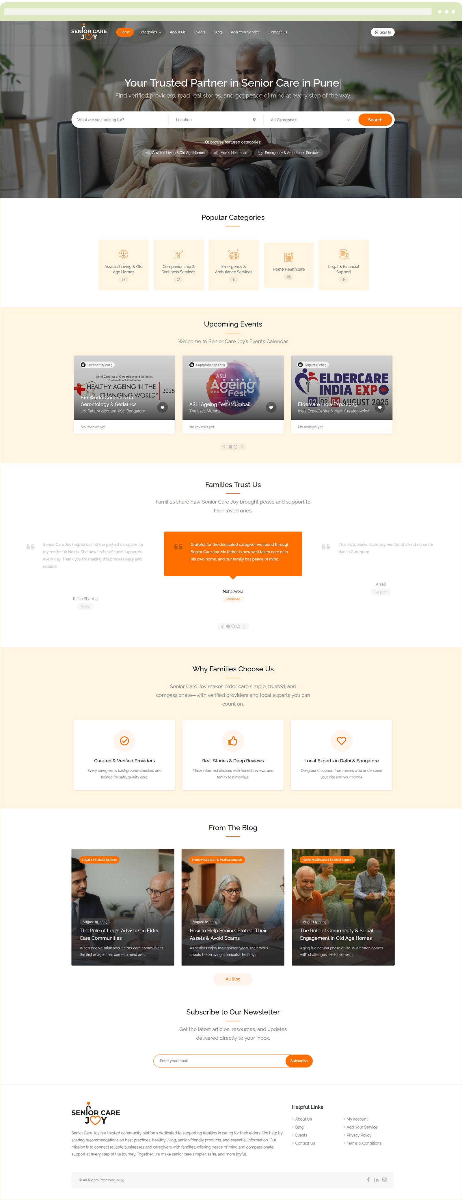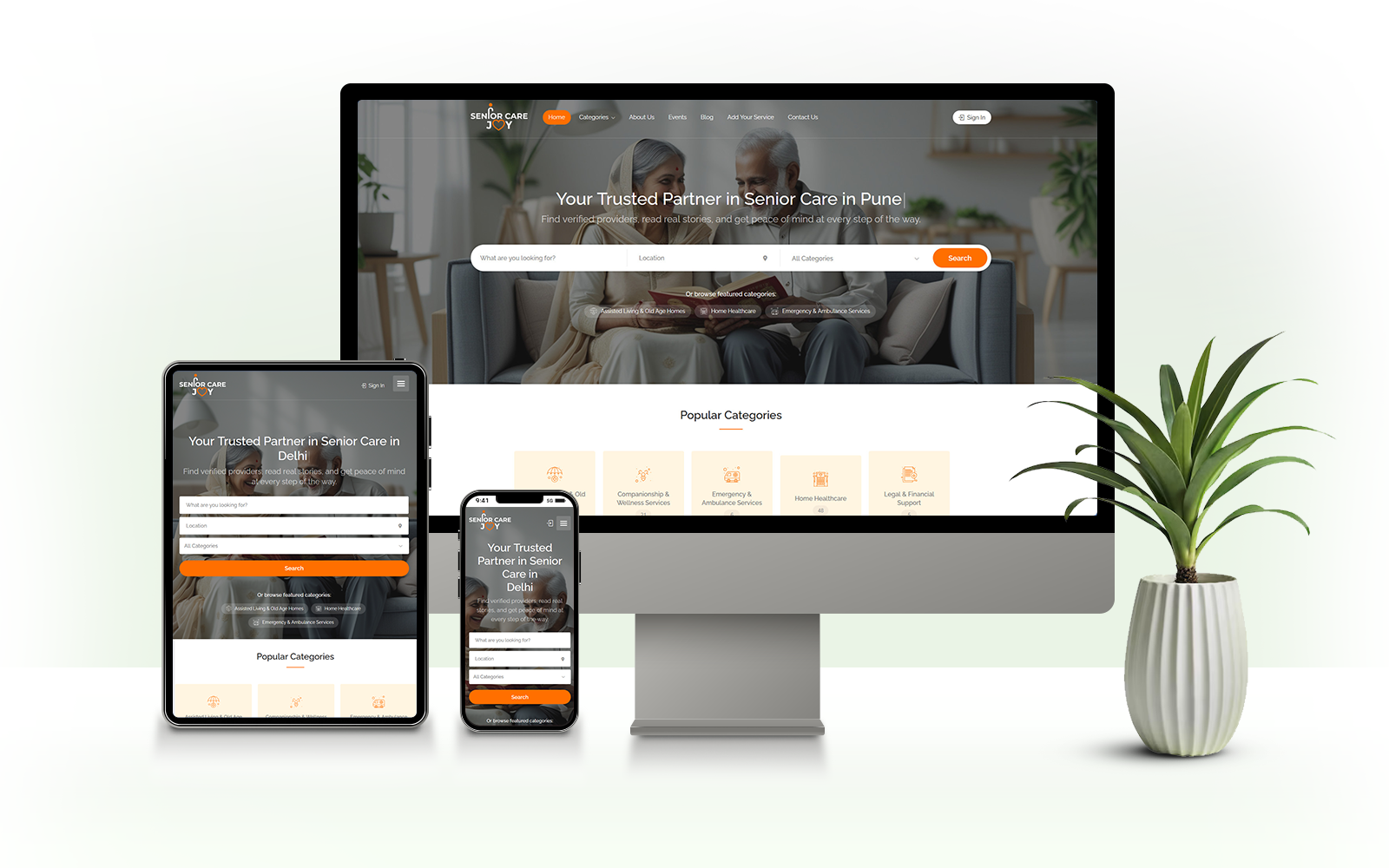 Senior Care Joy is an India-based healthcare startup providing listings of in-home care services for seniors, including assisted living, home healthcare, and emergency support. Refresh Ideas delivered a responsive UI/UX design and WordPress development to create a user-friendly platform. The solution enhances Senior Care Joy’s online presence, improves service discoverability, and engages users effectively, supporting their mission to simplify and elevate senior care services.